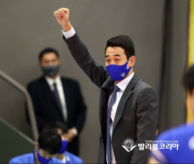 [[포토] 고희진 감독 '짜릿한 득점에 두 손 번쩍']
