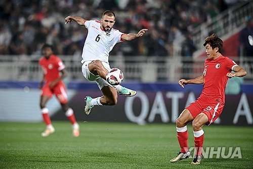QATAR-DOHA-FOOTBALL-AFC ASIAN CUP-GROUP C-HKG VS PLE -- DOHA, Jan. 24, 2024 (Xinhua) -- Michael Udebuluzor (L) of China's Hong Kong heads the ball with Ameed Mahajneh of Palestine during the Group C match between China's Hong Kong and Palestine at AFC Asian Cup Qatar 2023 in.