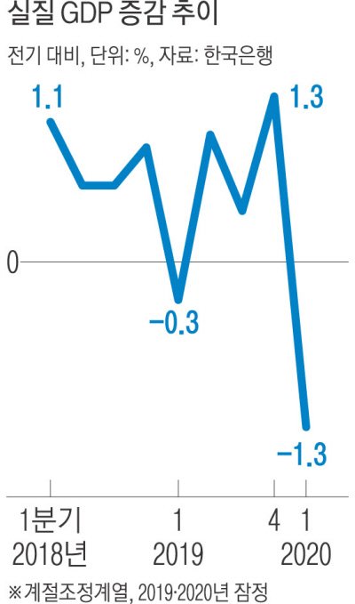한국은행은 올해 1분기 한국의 실질 국내총생산(GDP) 성장률이 마이너스를 기록할 수 있다고 17일 전망했다. 한은은 금융통화위원회가 기준금리를 연 2.75%로 동결한 뒤 배포한 ‘경제 상황 평가’에서 “1분기 성장률은 2월 전망치 0.2%를 밑돈 것으로 추정되며, 소폭의 마이너스 성장 가능성도 배제할 수 없는.